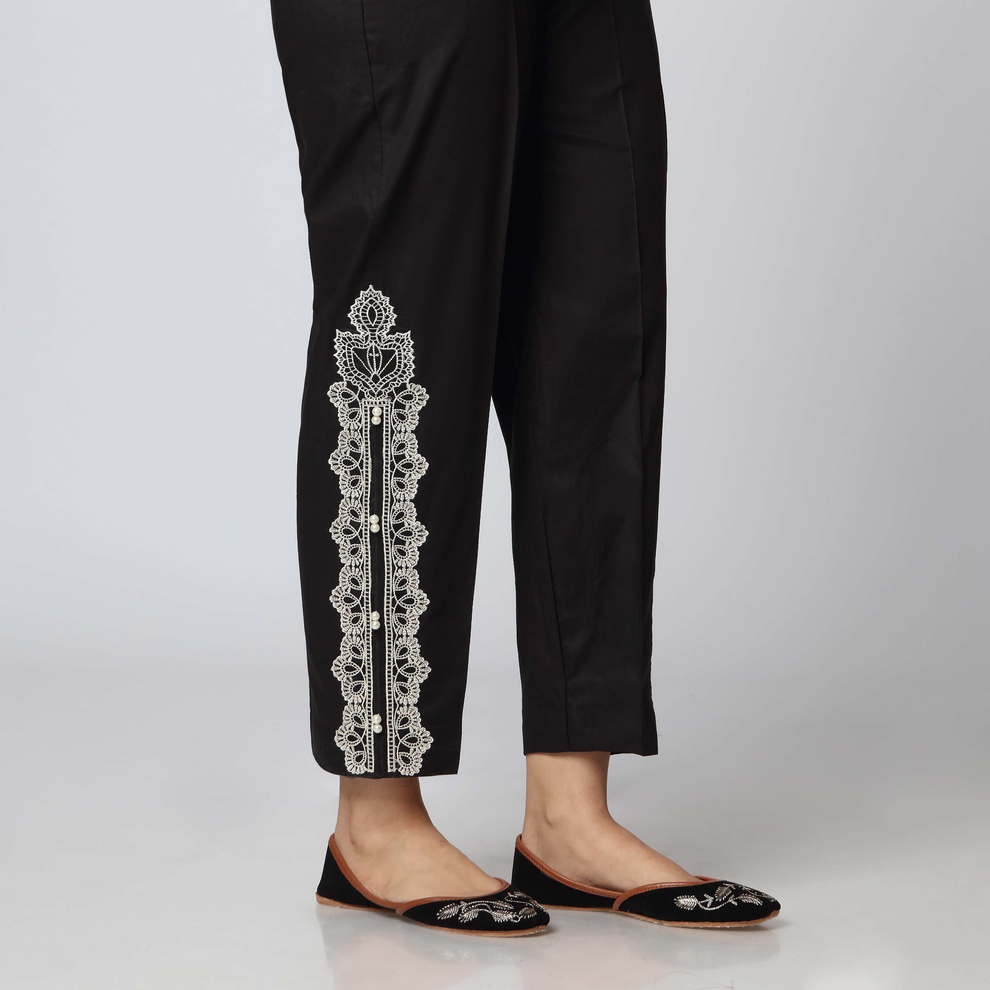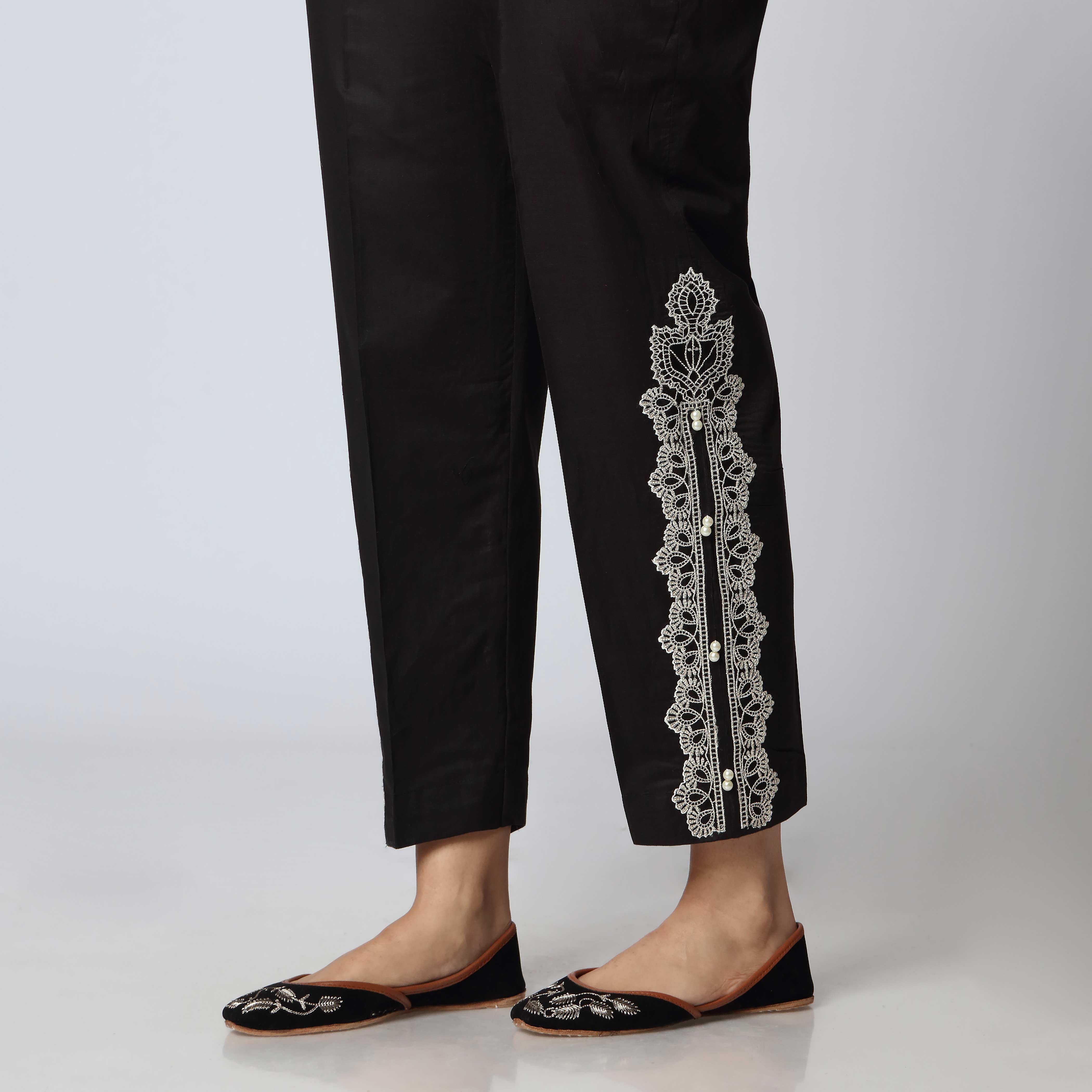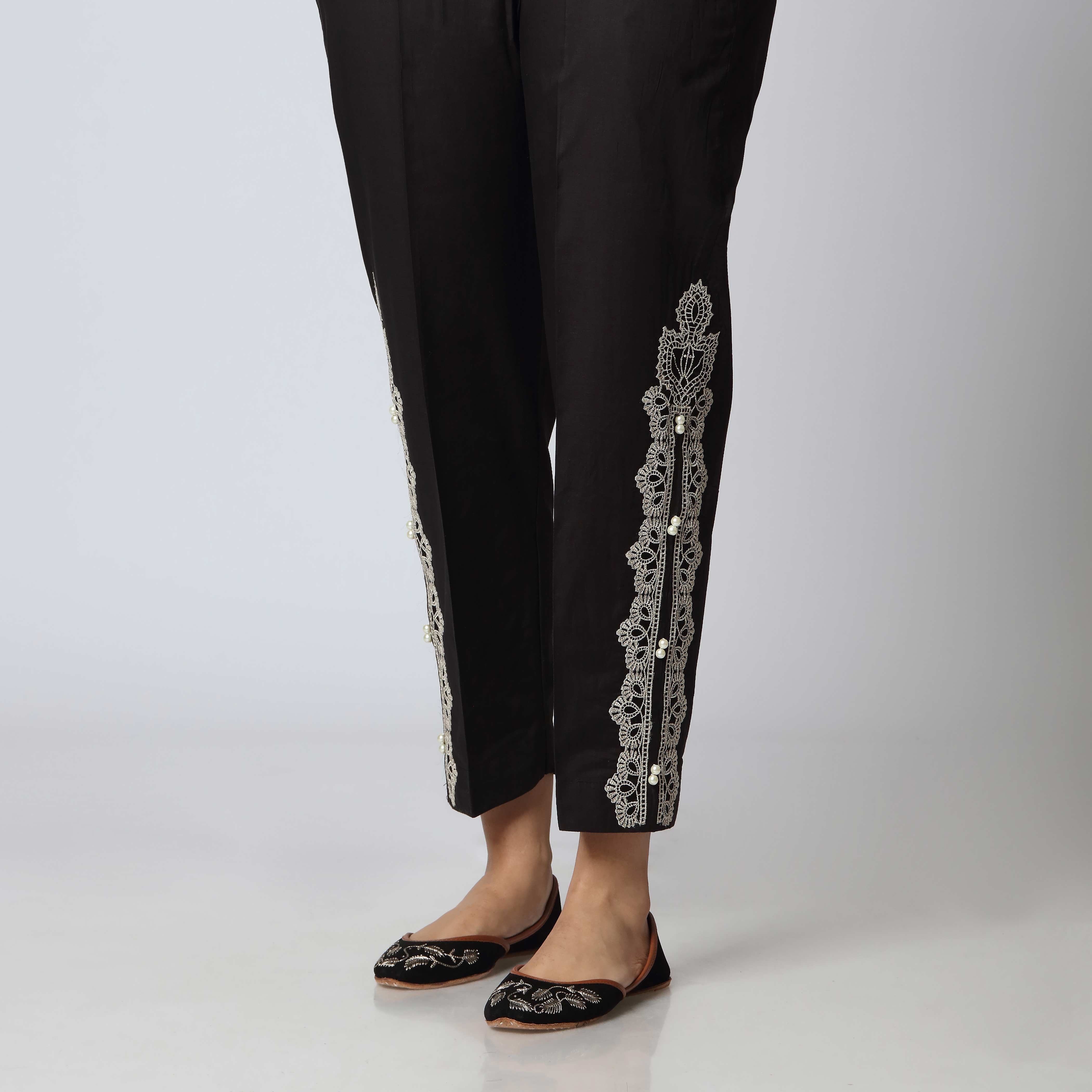 Versatile cambric embellished slim fit trousers in black color.